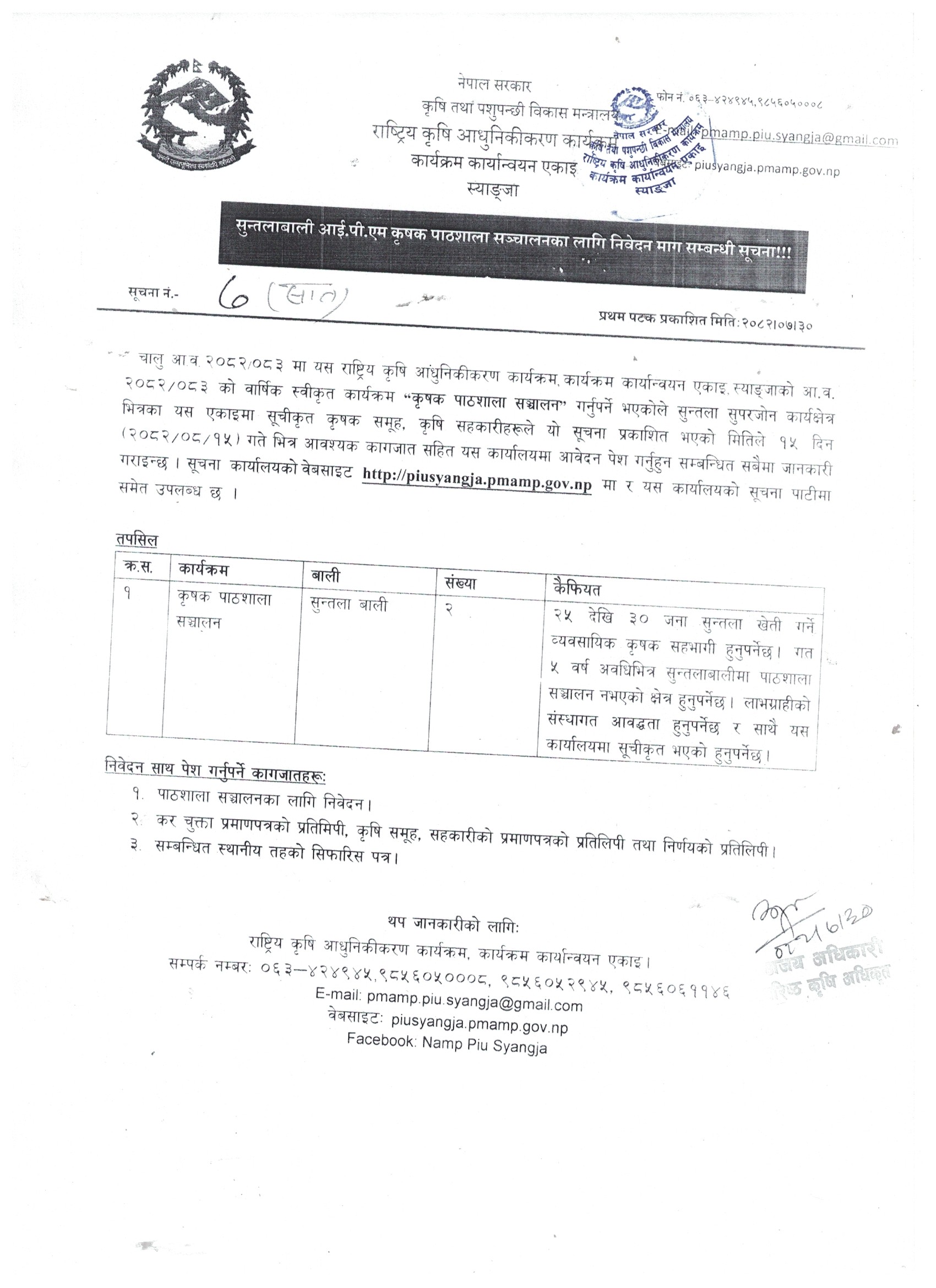 आ.व. २०८२/०८३ सुन्तलाबाली आई पि एम कृषक पाठशाला सञ्चालनका लागि निवेदन माग सम्बन्धी सूचना।