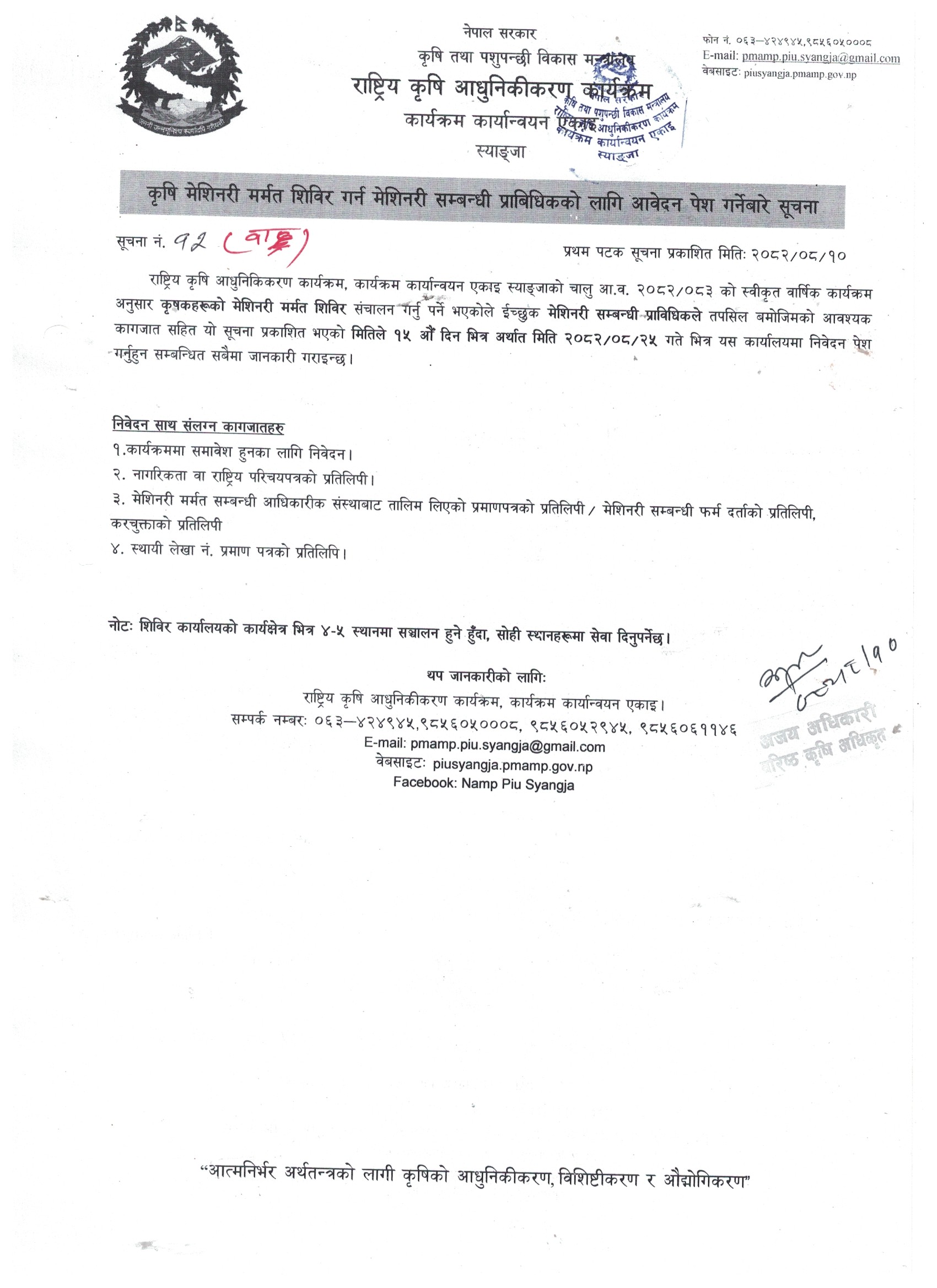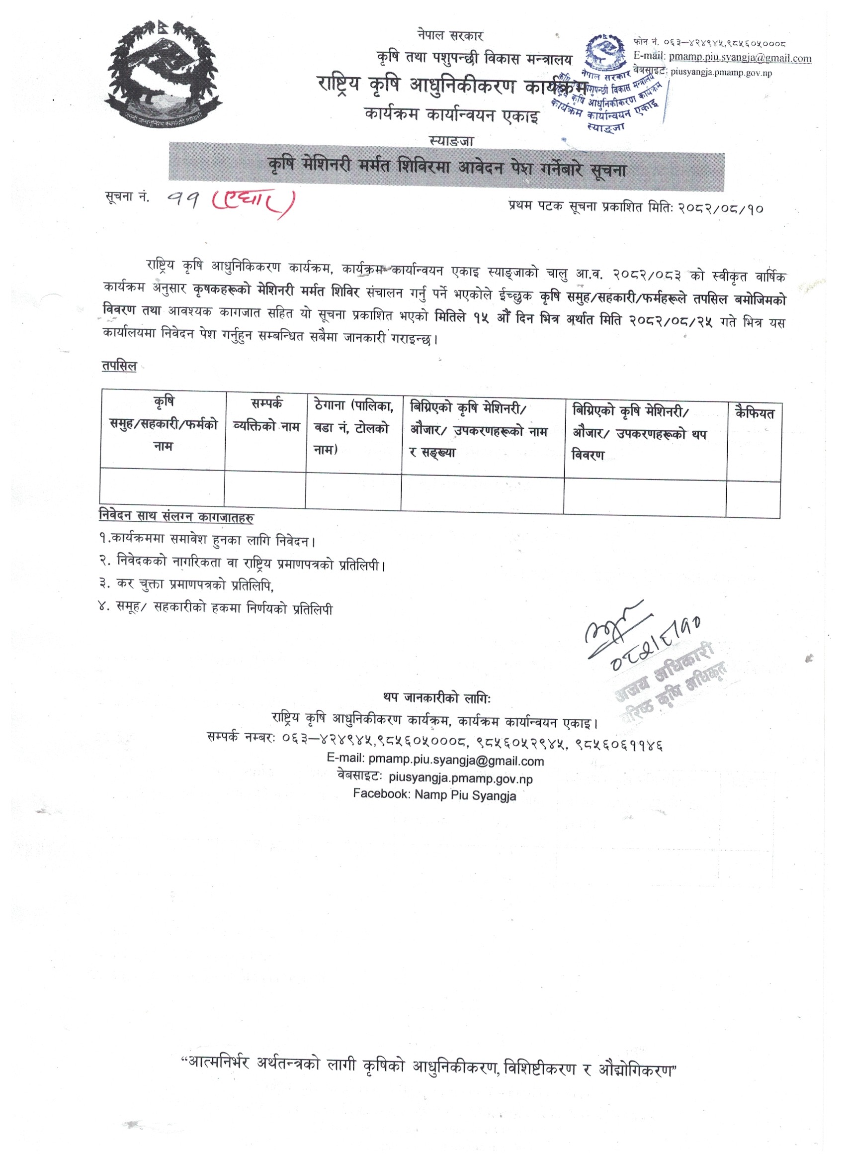 आ.व. २०८२/०८३ कृषि मर्मत शिविरमा कृषकहरूले आवेदन पेश गर्ने बारे सूचना