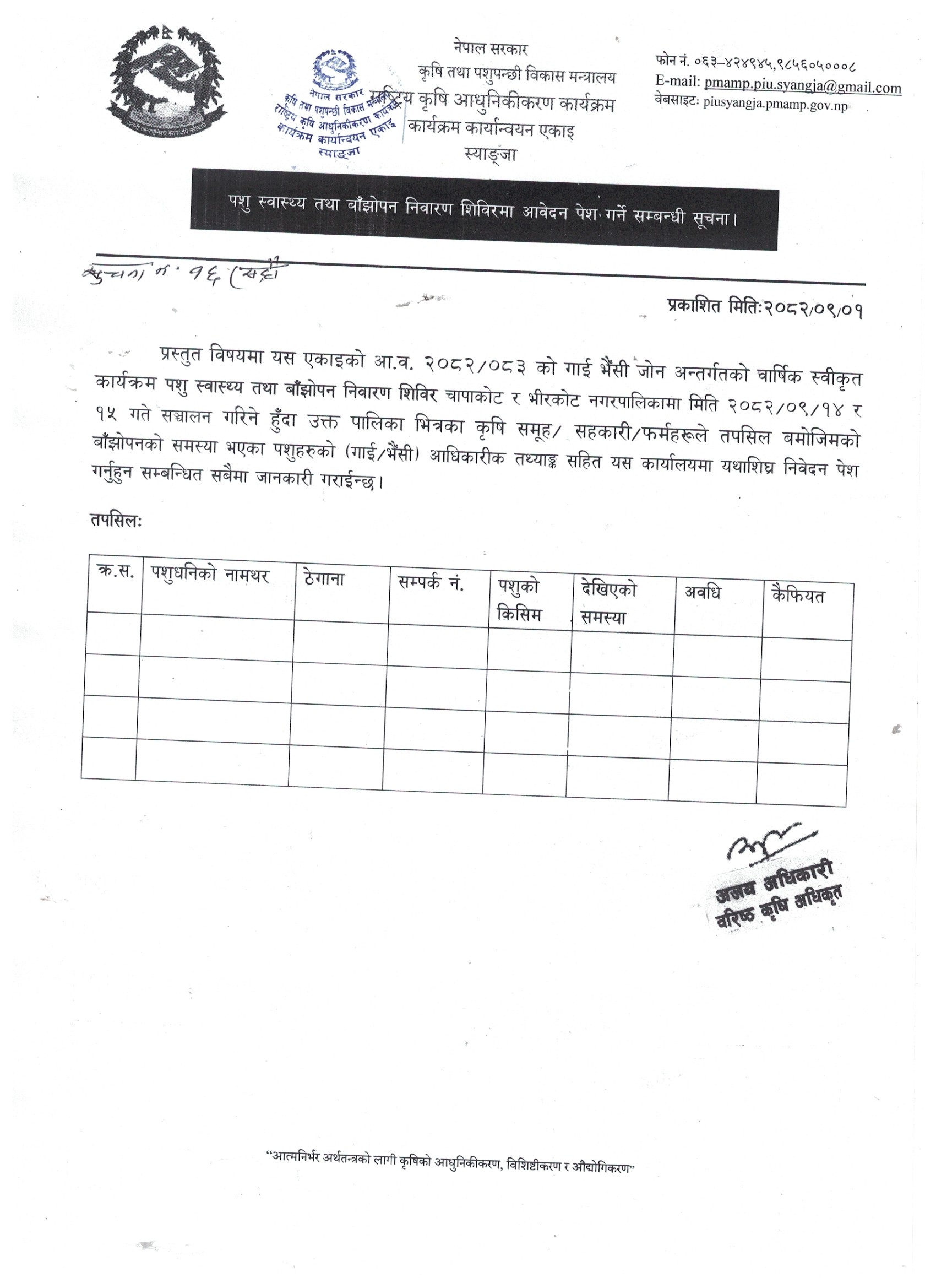 पशु स्वाश्थ्य बाझोपन निवारण शिविरमा आवेदन पेश गर्ने सम्बन्धी सूचना आ.व.२०८२/८३
