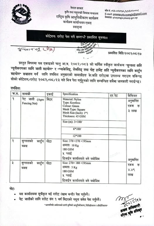 आ.व. २०८२/०८३ नेट जाली र कार्टुनको दररेट पेश गर्ने सम्बन्धी सूचना।