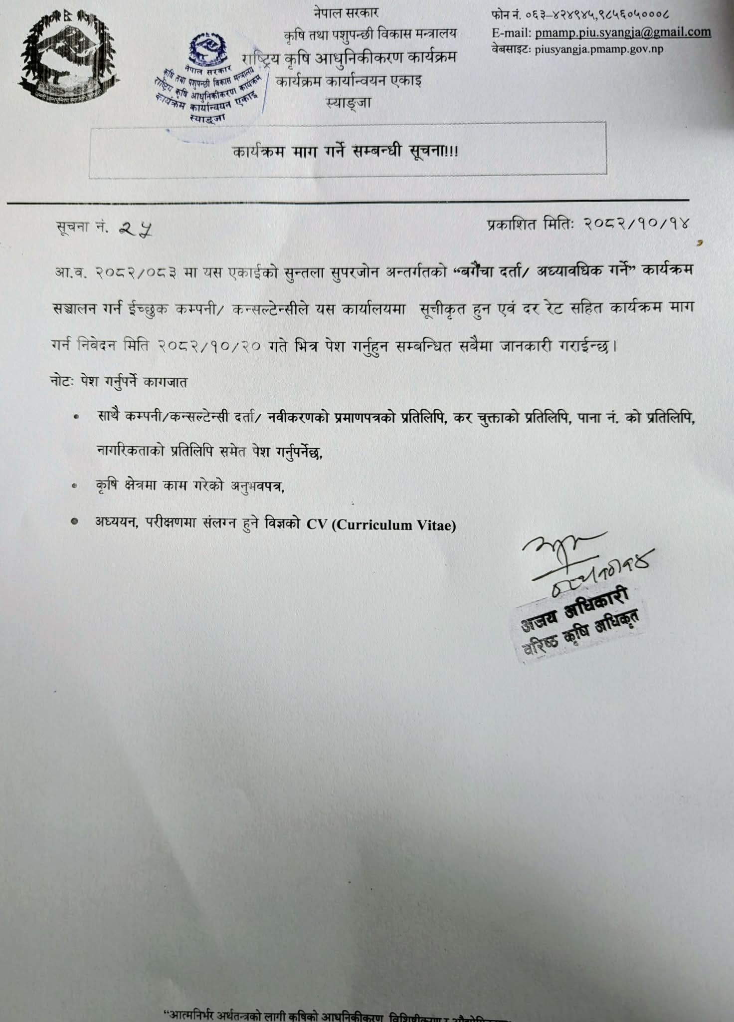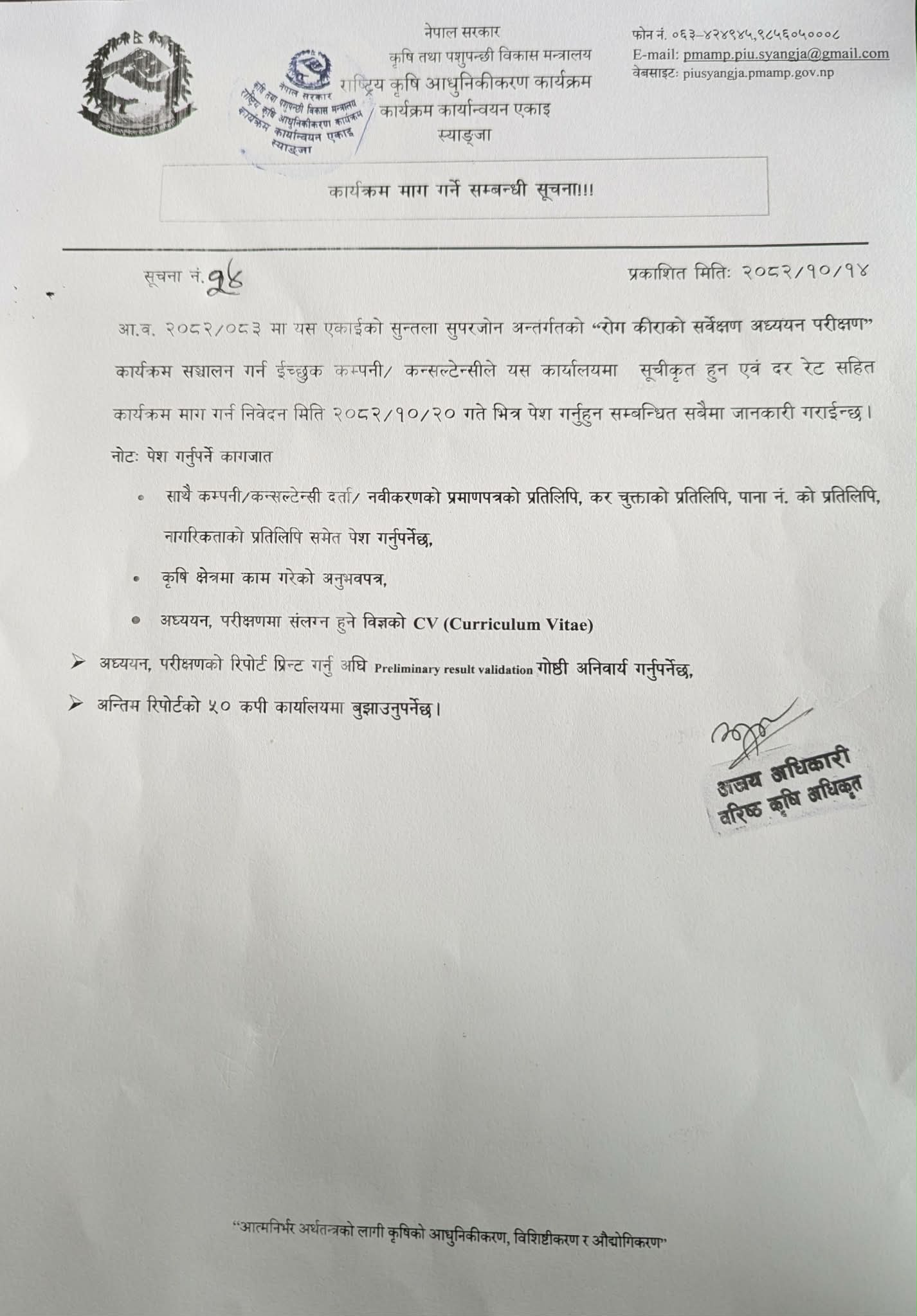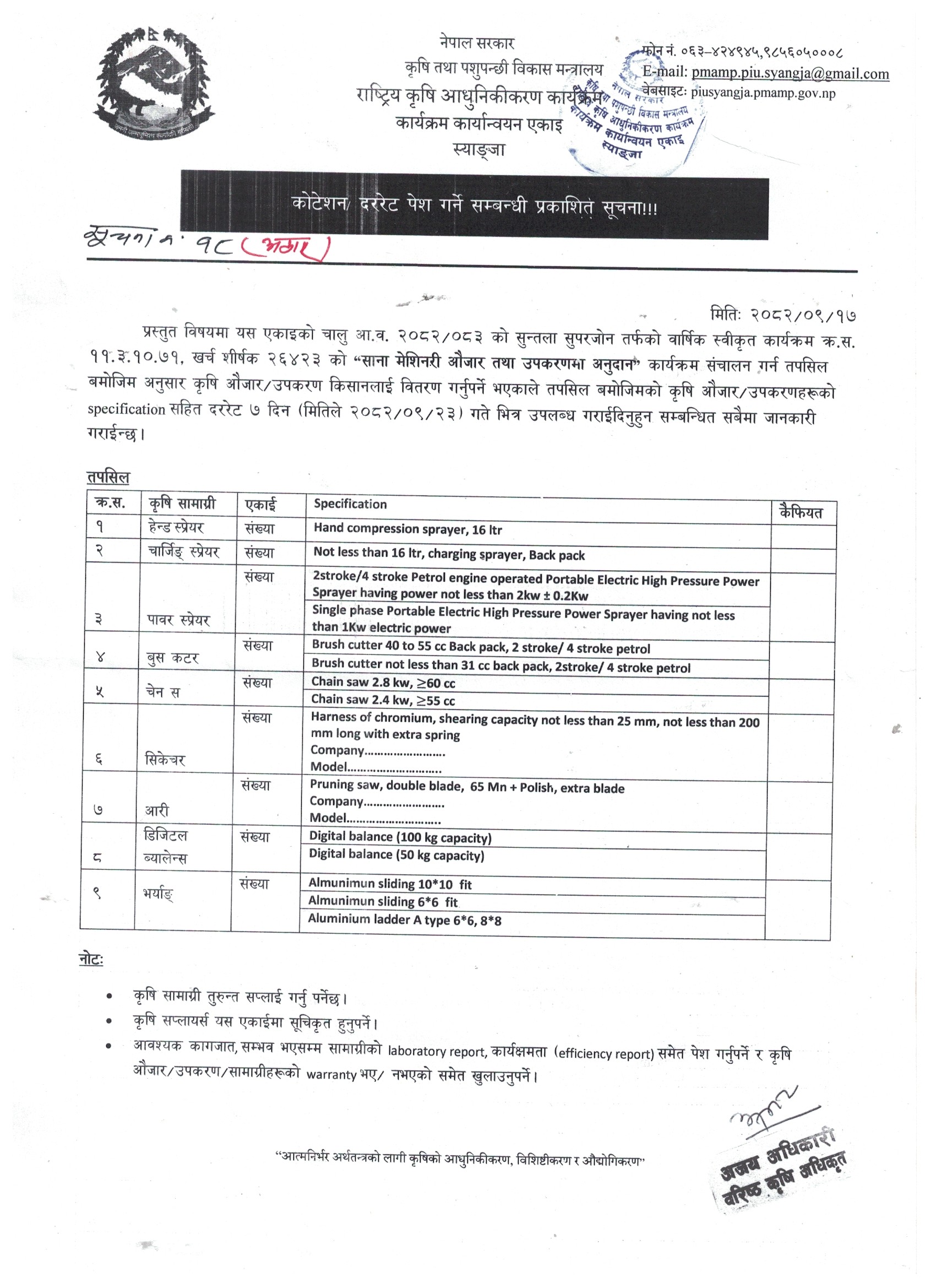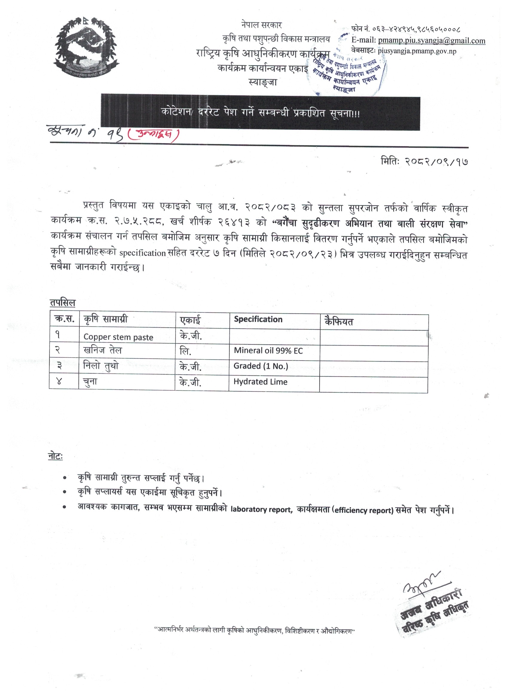 २०८२/०८३ कृषि सामाग्रीको दररेट पेश गर्ने सम्बन्धी सूचना